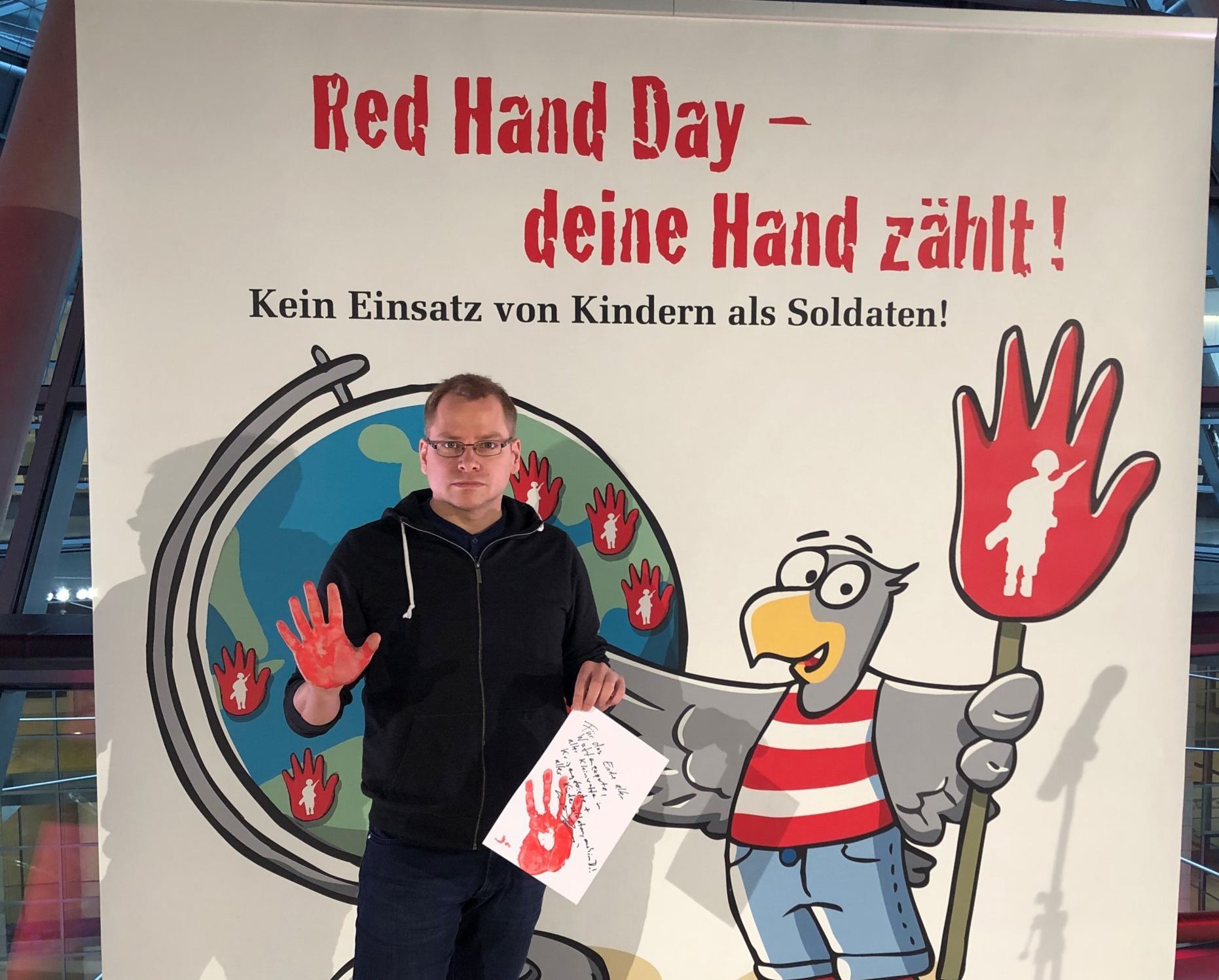 Morgen ist der "Red Hand Day", der an den Missbrauch von Kindern als Soldat*innen erinnert. Auf der Fraktionsebene im Deutschen Bundestag können heute Politiker*innen ihren Händeabdruck gegen den Einsatz von Kindern als Soldaten abgeben.