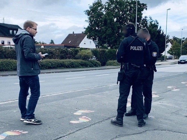 Eine Wanne überholt uns, bremst uns aus, die Tür wird aufgerissen: "Wir führen jetzt eine anlasslose Personen- und Fahrzeugkontrolle durch." Mein Mitarbeiter Tim steigt aus, wir müssen sitzenbleiben.