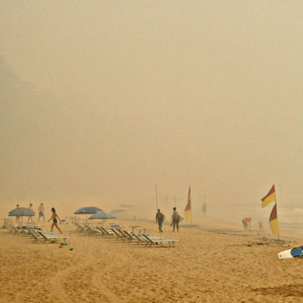 Rauch am Strand von Manly. Wie der Rest von Syndey ist dieser Stadteil von den riesigen Buschfeuern betroffen, die Gesundheitsgefährdung ist immens, aber die Menschen gehen weiter ins Wasser, simulieren Normalität.